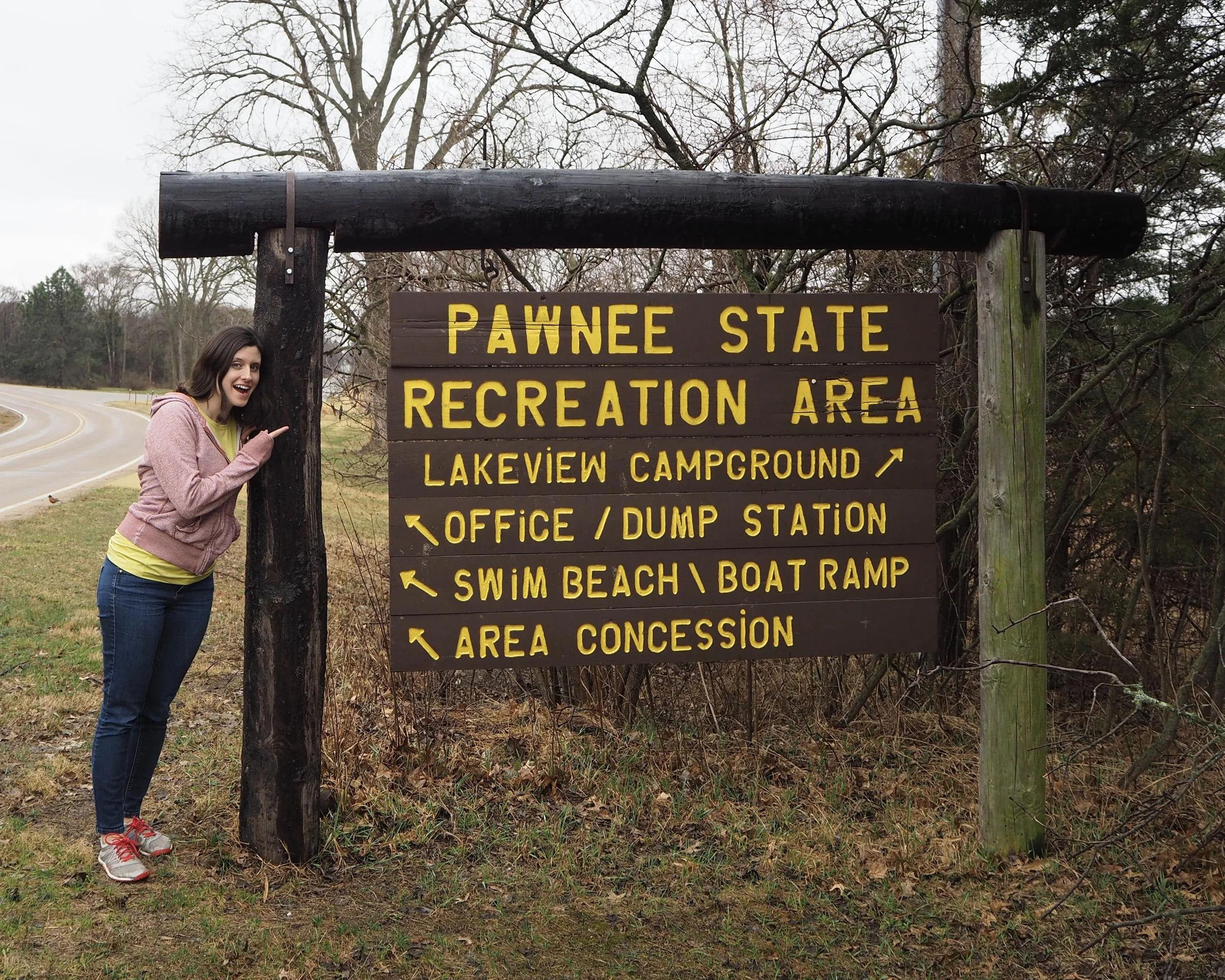 The last place we NEEDED to stop was the Pawnee State and Recreation Area. We love the TV show Parks & Rec. Even though it was dreary out, we got to stop and check out the large lake there and potty the dogs.