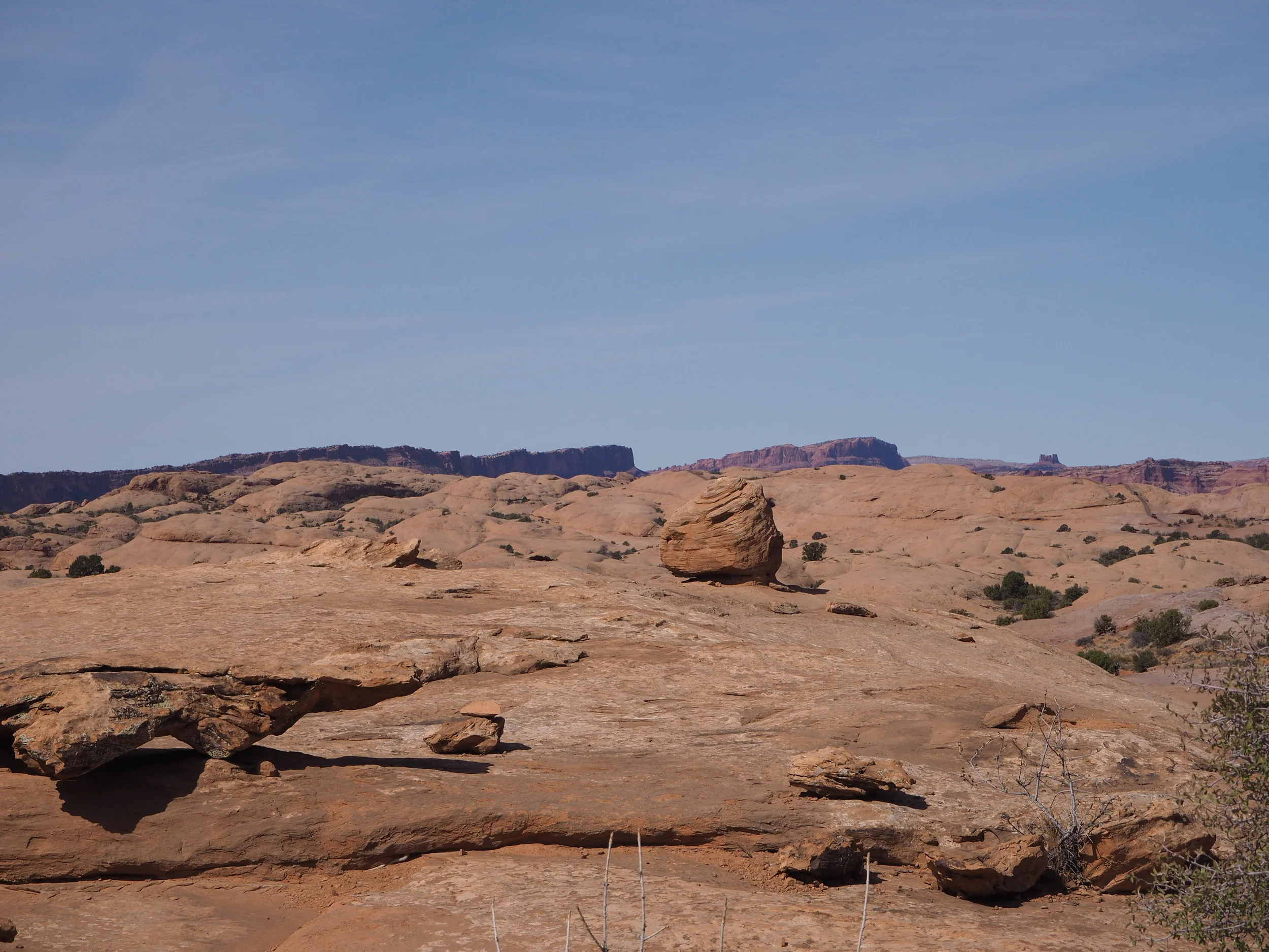 Finally we made it to Moab! The La Salle Mountain range was in view to the East. It was very picturesque driving into Moab, a small adventure touristy city, with large red immovable sand dunes, with large mountains in the background. We stayed at the Sand Flats Recreation Area, the place is like another world. There are 4 x 4 trails (one called Hell's Revenge!!!) that Jeeps and dune buggies drive up! There are miles of mountain biking/hiking trails across the sea of solid rock. We stayed the first night in a nook of one of these monstrous rock dunes right in Loop A. The ground is a rich red sand with shrubs and small brush sparsed throughout. That night we took the dogs up on top of the rock and watched the sun set. We met a cool guy from Washington, in Moab to do a race with his RC dune buggy. He had that with him and the dogs were intrigued, especially Beau.